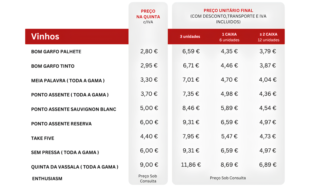 Os preços dos produtos apresentados já incluem IVA. Os preços “Em Casa do Cliente” são preços finais, já incluem descontos, custos de envio para Portugal Continental e IVA. As promoções realizadas no site não são aplicadas na loja física ( Adega da Quinta da Vassala).
