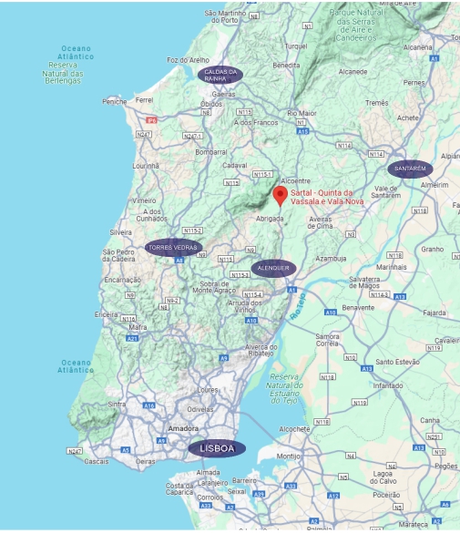 Quinta da Vassala and Quinta da Vala Nova are located at km 49 of the National Road 1, north of Lisbon, in the municipality of Alenquer and in the Lisbon Wine Region. Together, they form an agricultural estate of 400 hectares, of which 100 hectares are dedicated to vineyards.